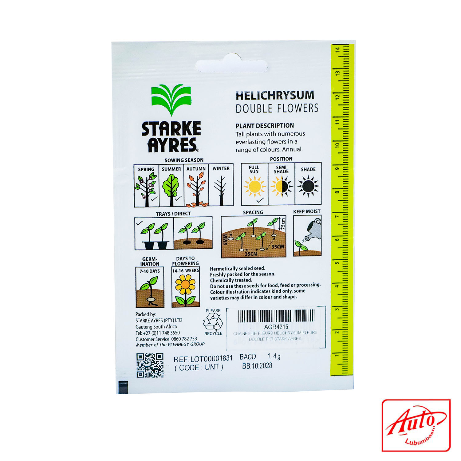 L’Hélichryse Fleurs Doubles de Starke Ayres est une fleur séchée classique, aussi appelée immortelle ou strawflower, connue pour ses pétales secs et colorés qui conservent leur forme. Les plantes atteignent jusqu’à 75 cm de hauteur, avec une ramification vigoureuse et une floraison abondante. Parfaite pour les massifs ensoleillés, les bouquets secs ou les jardins de fleurs coupées. La germination prend 7 à 10 jours, et la floraison intervient entre 14 et 16 semaines. Les graines sont traitées chimiquement et scellées hermétiquement. Ne pas utiliser pour l’alimentation ou la transformation