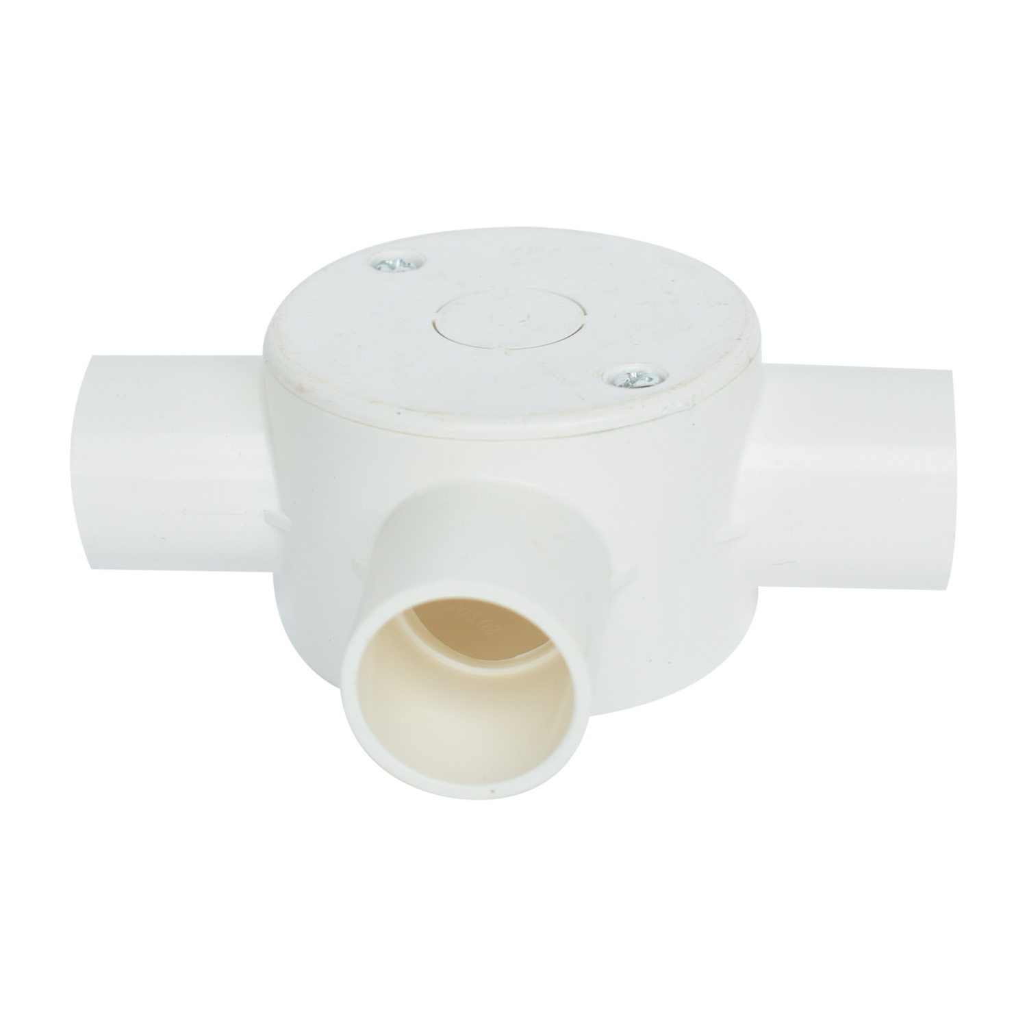 Cette boîte de jonction ronde 3 voies est conçue pour les systèmes de conduits électriques en apparent, offrant un espace sécurisé pour le raccordement et le dérivage des fils. Avec un diamètre de 65mm et une profondeur de 40mm, elle dispose de trois entrées Ø25mm—généralement deux latérales et une en bas—compatibles avec les gaines annelées ou rigides en PVC de 25mm.