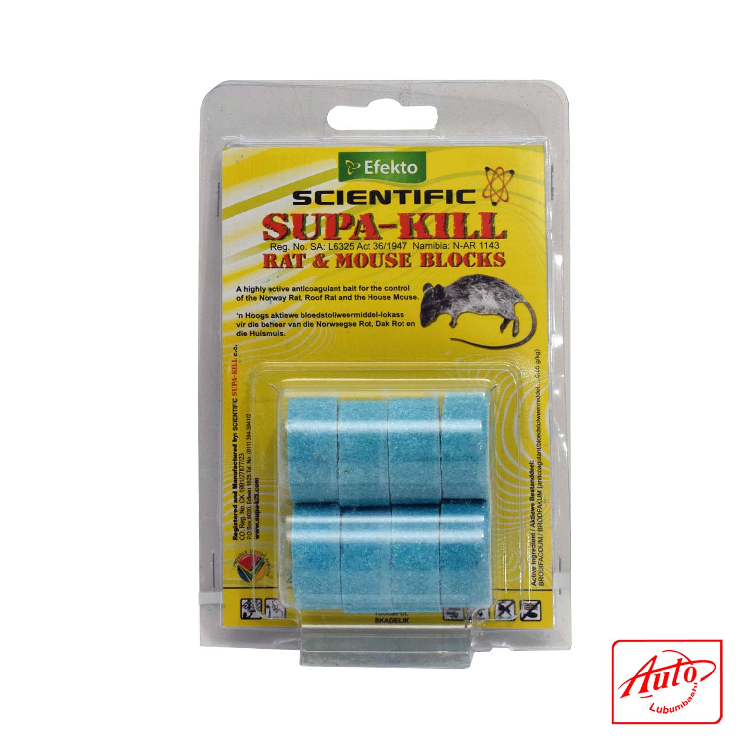 Les blocs Supa-Kill Rats & Souris sont formulés avec du Brodifacoum (0,05 g/kg), un anticoagulant de seconde génération hautement efficace après une seule ingestion. Ces blocs sont faits de matières alimentaires attractives, compressées pour une prise facile.