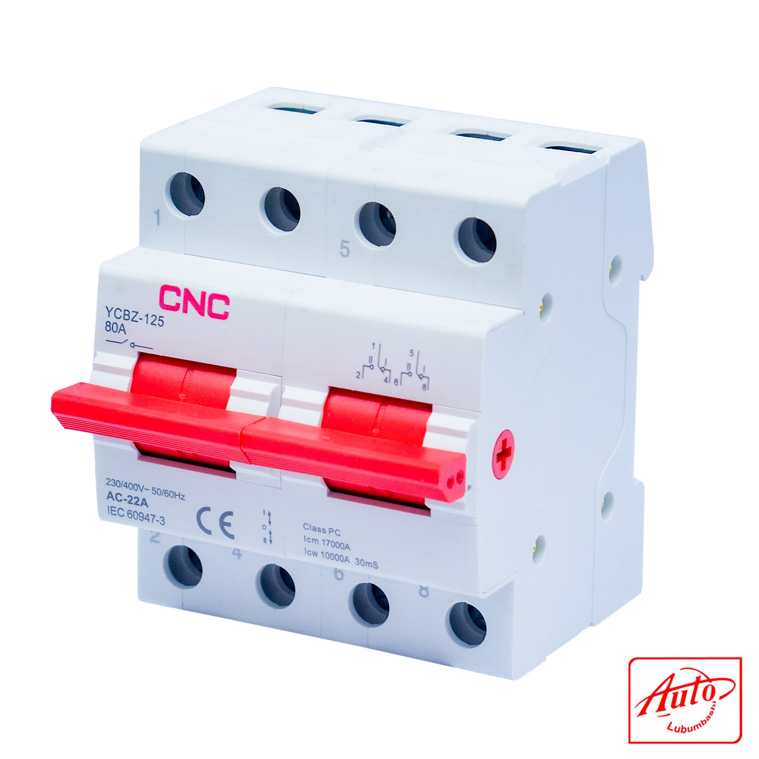 The CNC YCBZ-125 2P 80A is a robust manual changeover switch designed to transfer power between two sources—typically grid and generator—in single-phase or split-phase systems. It functions as a switch disconnector, capable of switching on, loading, and breaking circuits under normal operating conditions.