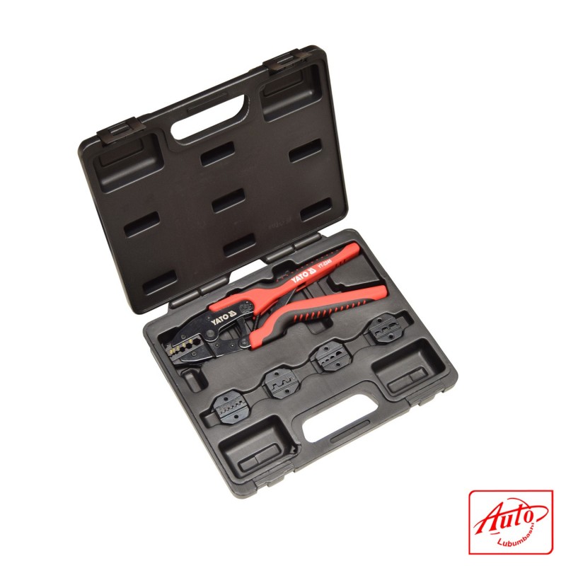 Yato professional electricians ratchet crimping tool set quick release. – High quality hardened jaws provide efficient crimping. – Rubber soft grip non slip handles for comfort of work – Total lenght 260mm – Crimping specyfication ( see 3rd picture ): 20-10(AWG) 0.5-6mm; 22-10(AWG) 0.5-6mm; 20-8(AWG) 1.5-10mm; 22-12(AWG) 0.5-4mm. – Quick release mechanism. vat invoice with every order. Check out our othe items for professional hand tools.
