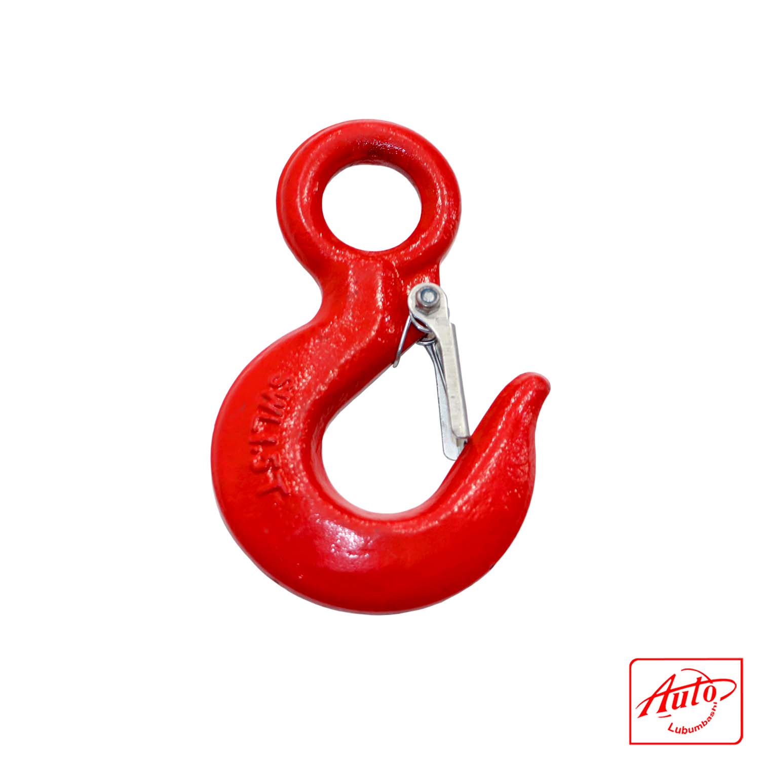 The eye design allows secure attachment to chain slings or lifting devices, while the safety latch prevents accidental disengagement during lifting.
