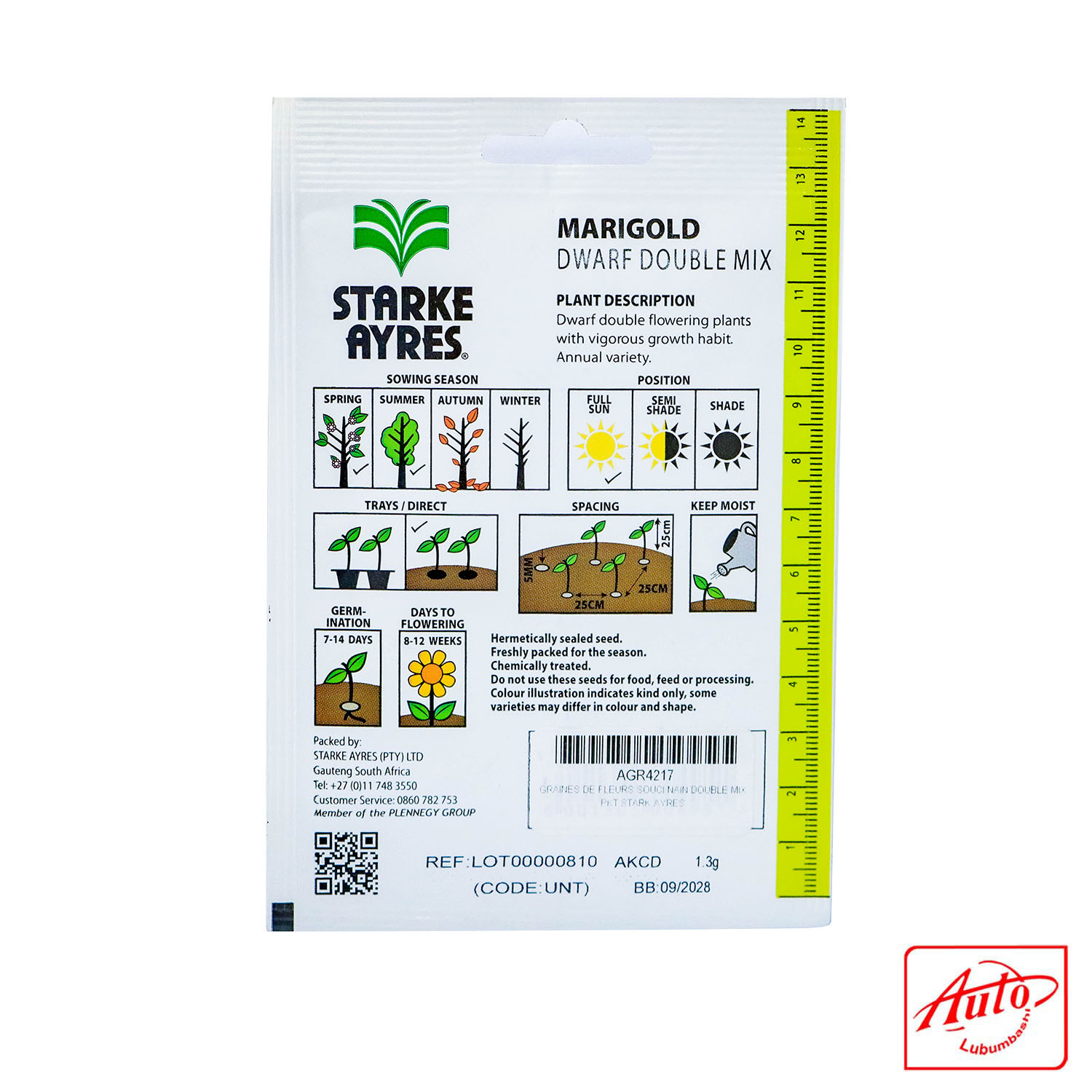 The Dwarf Double Mix Marigold from Starke Ayres is a cheerful, easy-to-grow annual that produces dense, double flowers in a variety of bright colors. With a compact height of around 25 cm, it’s perfect for mass planting, edging, or pots. This variety thrives in full sun, tolerates semi-shade, and blooms 8–12 weeks after sowing. Seeds are chemically treated and hermetically sealed for freshness and safety. Not intended for food, feed, or processing.