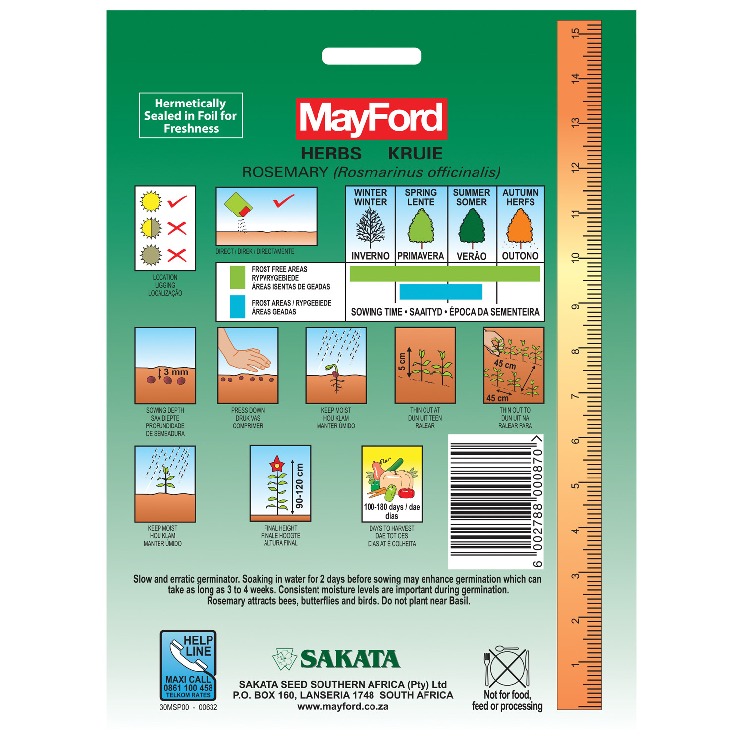 The MayFord Rosemary (Rosmarinus officinalis) is a slow and sometimes erratic germinator, often taking 3 to 4 weeks to sprout. Soaking the seeds in water for two days before sowing may help enhance germination. It is best sown directly into well-drained soil, ensuring a sowing depth of 3 mm, and requires consistent moisture during the early stages.