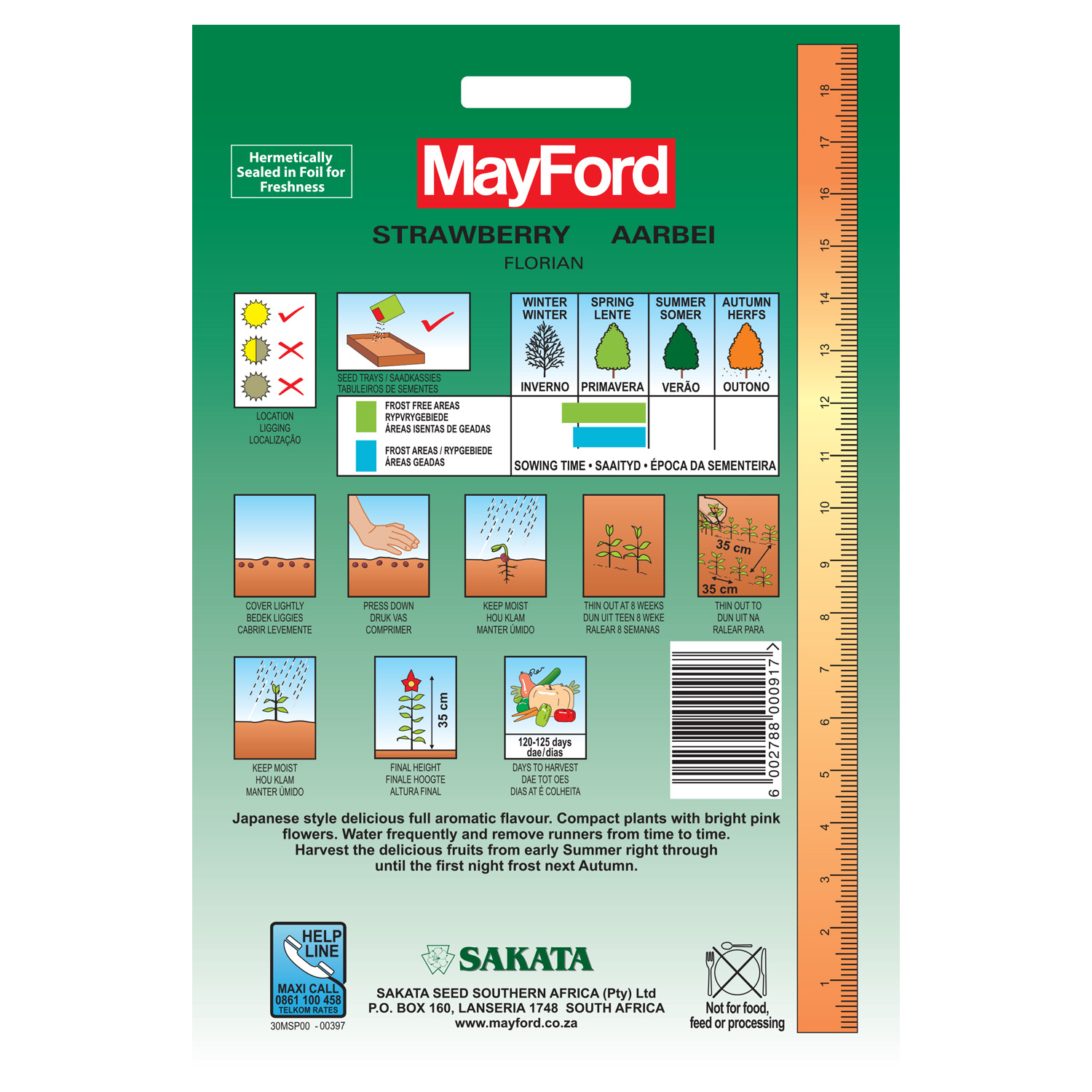 The MayFord Florian Strawberry is a vigorous and flavorful variety, ideal for home gardens and container growing. It is best sown in seed trays, lightly covered, and kept consistently moist for successful germination.