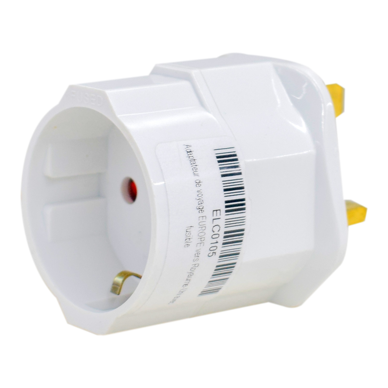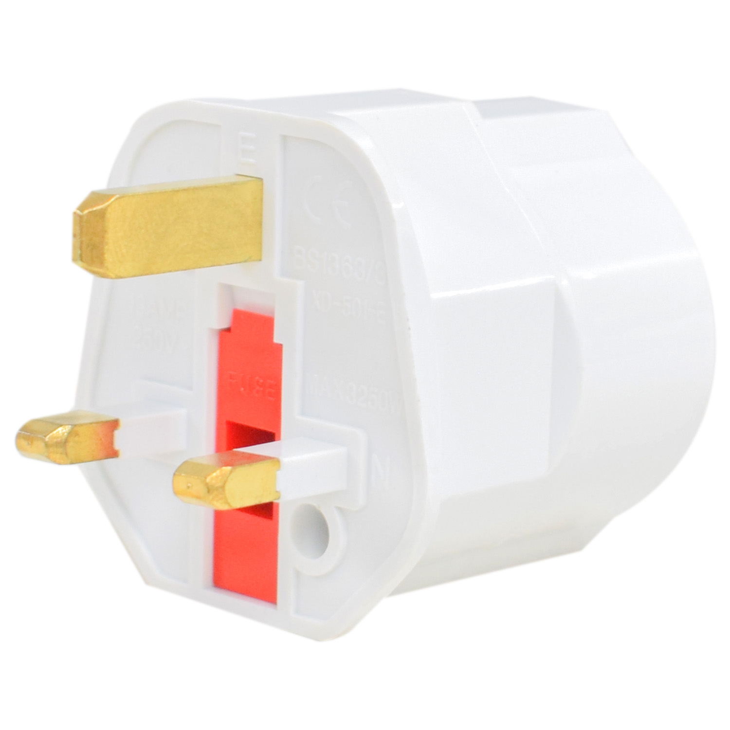 This UK plug adapter is designed to convert a standard British 3-pin plug into a Schuko-style 2-pin socket, allowing European appliances to be used with UK mains power. It features a built-in 13A fuse, offering protection against overloads and short circuits.