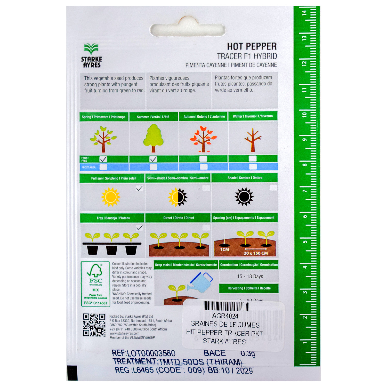 The Starke Ayres Hot Pepper Tracer F1 Hybrid is a high-yielding variety, widely appreciated for its spicy heat, uniform fruit shape, and reliable growth. It is best sown in seed trays or directly into well-drained soil, ensuring a spacing of 20 cm between plants and 150 cm between rows.